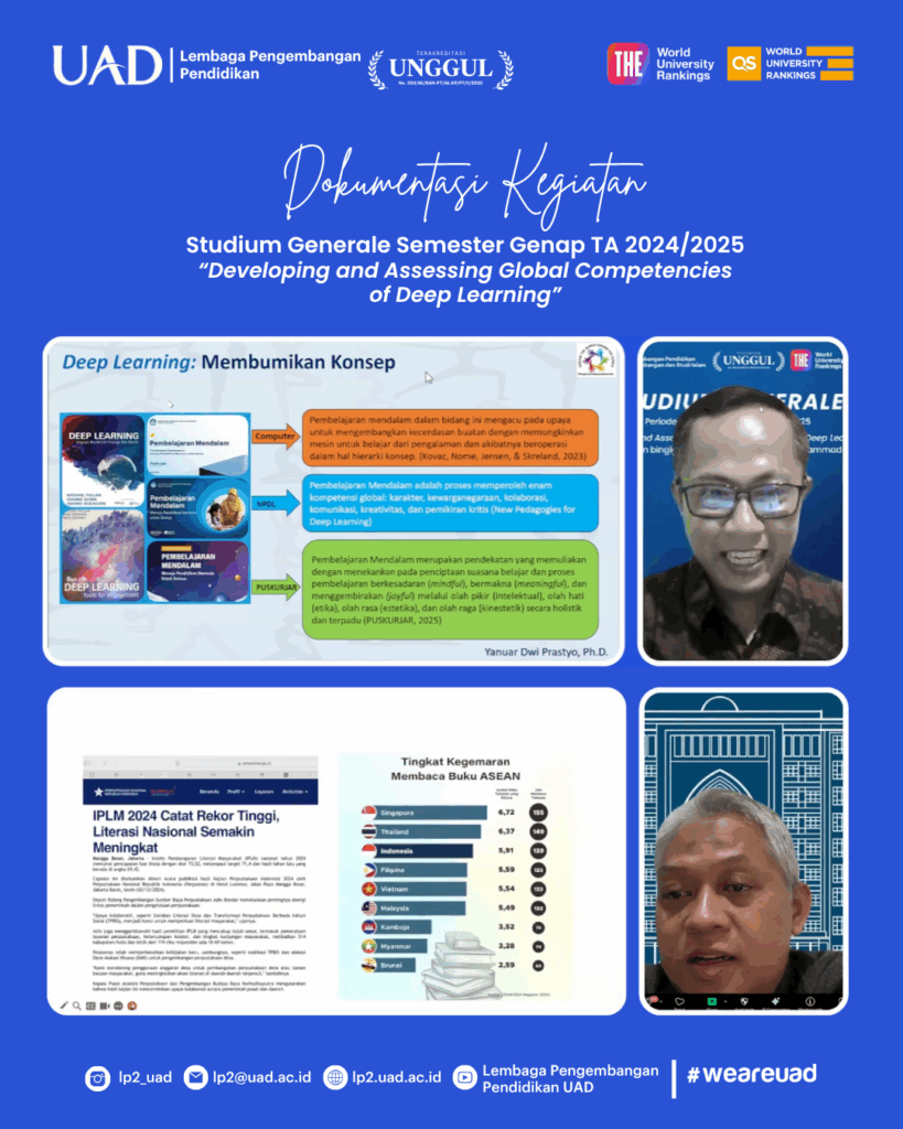 Yogyakarta (09/10). Universitas Ahmad Dahlan (UAD) melalui Lembaga Pengembangan Pendidikan (LPP) dan Lembaga Pengembangan dan Studi Islam (LPSI) sukses menyelenggarakan Studium Generale ke-10 secara virtual pada Rabu, 8 Oktober 2025. Acara ini ditujukan bagi mahasiswa program magister, doktoral, dan profesi Read More …